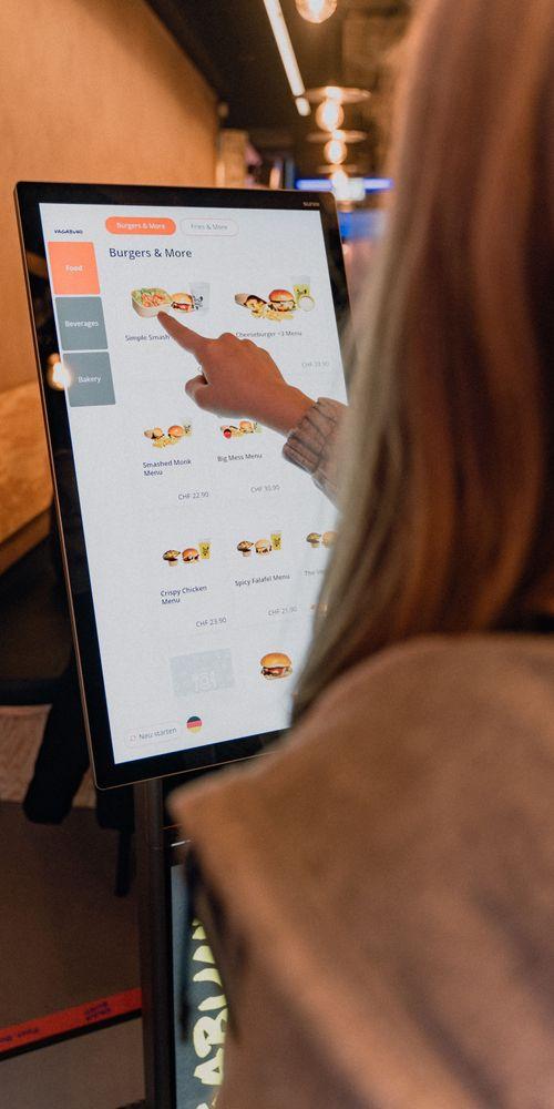 The kiosk suggests suitable extras to guests — more sides, larger portions, desserts. More sales without extra effort.